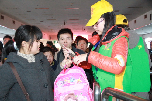 通过“南昌铁路”官方微博征集来的10名网友,身穿印有“南铁青年志愿者”的绿色小马褂、小黄帽,在车站工作人员的带领下或检票,或疏导人流,或帮困难旅客提供服务。
