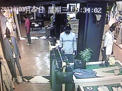 一名衣着光鲜的男子走进服装专卖店,大致看了货架上的衣服后,脱下外衣挑了一件准备试穿。女店员一看有生意上门,赶紧起身离开服务台去招呼顾客。这时候,门口一个身影闪进……