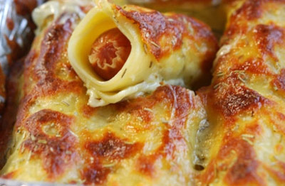 3.煮好的千层面取出,从中间切开一分为二。放入一根香肠卷起。