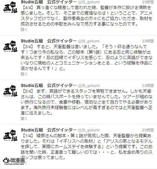 动画制作会社Studio五组的官方推特近日透露,在系列构成绫奈由仁子完成动画第1话脚本之后,天冲监督提出了一个提案“去英国取材吧,去找爱丽丝的家的原型地,去实际体验下寄宿外国家庭的感觉!”