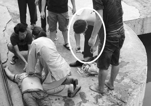 将人救上岸后,赵建生(图中被圈者)准备穿制服离开。网友提供图片