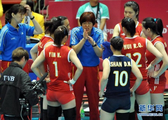 8月9日,中国队主教练郎平(中)在休息时指导球员。当日,在香港体育馆举行的世界女排大奖赛中,中国队以3比0战胜捷克队。新华社记者卢炳辉摄
