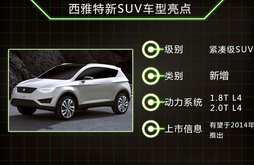 自西雅特进入中国市场以来,先后推出了LEON、伊比飒和等车型,但却无SUV车型。这款将推出的紧凑级SUV,基于大众MQB平台打造。外观方面,新车型将以2011年日内瓦车展上亮相的SUV概念车IBX为蓝本打造,并会借鉴其中的设计元素。车身尺寸与途观的相差无几并有望于2014年引入国内。