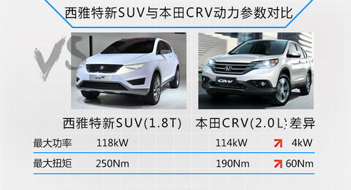 新车将与本田CRV在动力方面形成竞争。与本田2.0L发动机相比较来看,新车型搭载的1.8T引擎在最大功率上要优于对手。西雅特1.8T发动机达到的250Nm的峰值扭矩要比对手多出了60Nm。由此可见新车型的动力性要优于本田CRV。