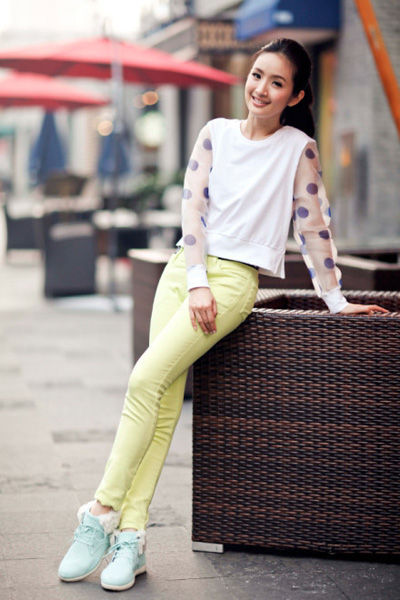 甜姐儿林依晨虽然年纪不小,但看起来依然青春可人,像这身糖果色的搭配就有非常好的减龄效果,淡柠檬黄的长裤加白色波点袖上衣和奶油蓝短靴,粉嫩的感觉好吸引人!