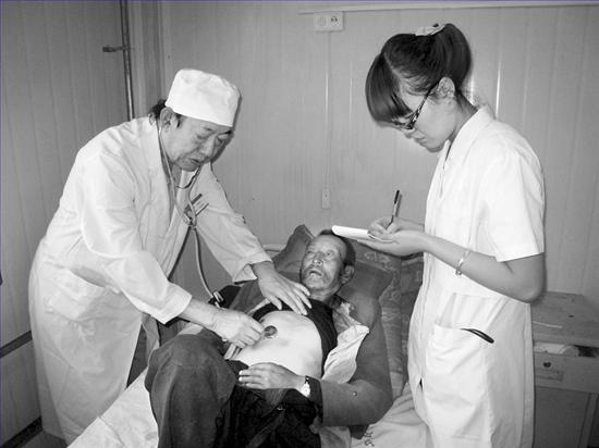蒲麻镇吊沟村64岁的五保户毛丑德躺在病床上,疼得直咧嘴。地震后,独居的毛丑德被埋在废墟8小时后,才被家人救出来,他的胸腔、腹腔均受到不同程度伤害。吴殿华对他进行了精心救治。就这样,一个病人一个病人地筛查,对于每位伤员,吴殿华都设身处地为对方着想。