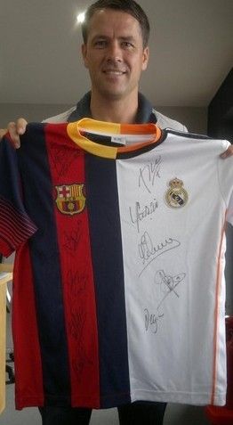 这件奇葩的球衣上面,也是签满了皇马元老队成员跟巴萨元老队成员的名字,密密麻麻,这让这件球衣更加具有价值。欧文得到球衣后,高调在自己的推特上宣布要把球衣送出去,欧文说:“上周在科威特进行的西班牙国家德比之战得到了这件球衣,我会把它装起来,然后下周把这件球衣送给我推特上的粉丝!”欧文还补充说:“这件球衣上有菲戈、莫伦特斯、耶罗、伊尔格纳、克鲁伊维特、赞布罗塔、门迭塔、拜亚、贝莱蒂以及我的签名!”