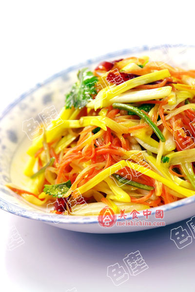 材料:胡萝卜300克、肥瘦肉100克、酸咸菜60克、蒜苗20克、生姜5克、盐少许。
