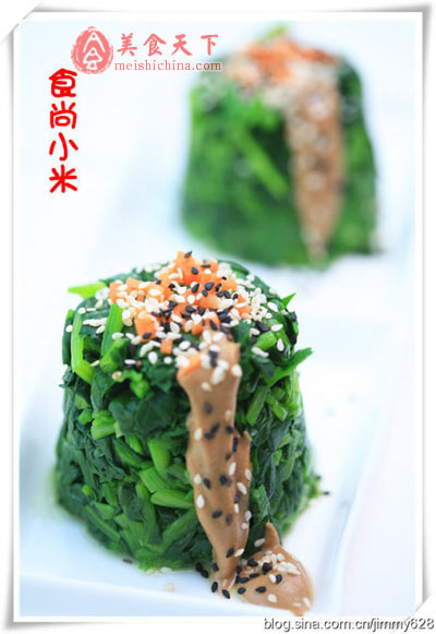 材料:菠菜、熟芝麻、芝麻酱、盐、鸡粉、芥末酱、米醋