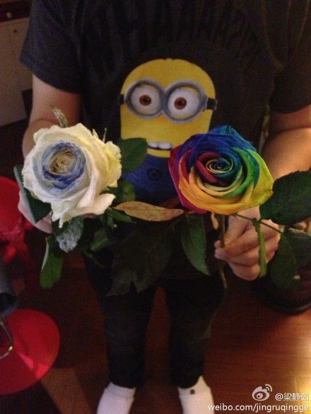 晚些时候,梁静茹更新微博:“收到特别的花”,晒出七夕节礼物——老公送她的彩色玫瑰花,由不同颜色组成的玫瑰看上去确实很漂亮,而当晚女主角拿着玫瑰的表情也非常陶醉。