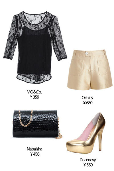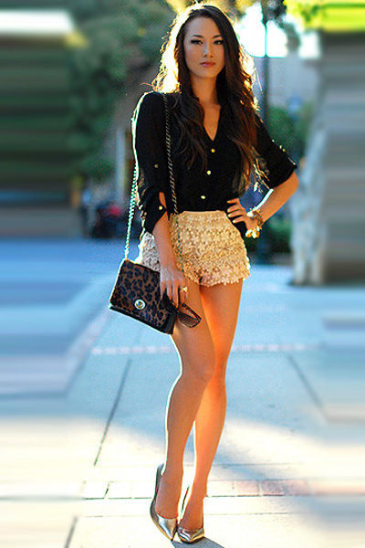 尖头细高跟、半透明黑色衬衫,让性感若隐若现,而金色花纹小短裤加身,让这种性感显得更加光彩耀人。