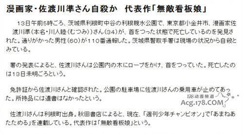 根据报道,警方是通过驾照确认死者的身份为佐渡川準,而死者的具体死亡时间是否在13日目前尚不明。另外,目前报道中并未提到遗书的内容,居住在东京都小金井市的佐渡川準不知为何选择了在老家结束自己的生命?漫画家中选择自杀的还有“蜡笔小新”的作者臼井仪人、“SWWEEET”的作者青山景,或许漫画家们工作压力巨大,都有着各自的苦闷吧?但是在最后小编还是要提醒大家,生命只有一次,请珍惜自己的生命,不要轻易放弃,做出无法挽回的选择。