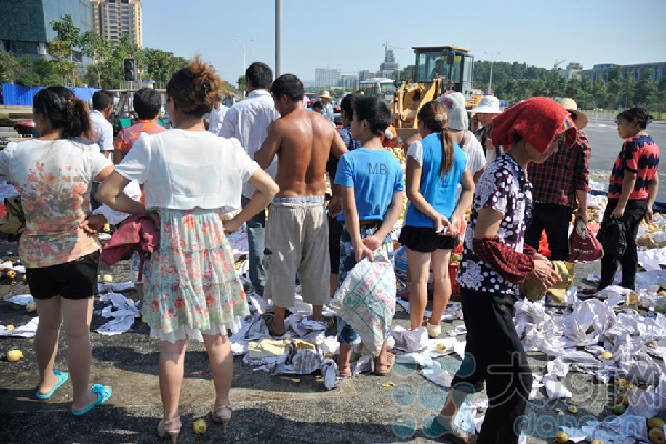 8月15日6时许,在信阳市羊山新区新24大街和新7大道交叉口,一辆牌号为豫s18630拉水果的大货车发生事故侧翻,车内散落出来的水果,遭部分路过市民哄抢。