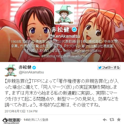 “同人标识(暂)”计划是受到讲谈社官方承认的。目的在于保护同人创作,赤松健将在自己的新连载漫画上首先使用,亲身试验它的有效性和也许存在的问题。赤松健一直非常关注TPP以及某改正案中对于同人创作和漫画家创作自由权益问题,并一直在为此奔走。这次又第一个站出来保护同人创作,行动力令人钦佩。