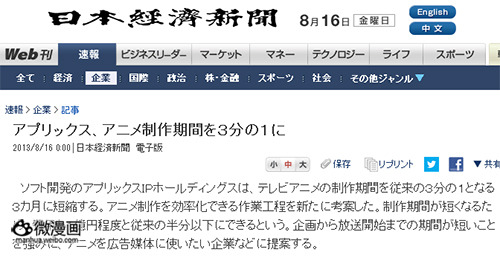 据《日本经济新闻》8月16日报道,开发公司Aplix-ip研究出了让TV动画制作过程更有效率的工作方法,可以让一部TV动画的制作周期缩减到原来的1/3——只需3个月就可以完成。这一方法已经在Aplix-ip的子公司,制作过《强袭魔女2》《天降之物》《我的朋友很少》等人气动画的AIC(Aplix-ip拥有97.56%股份)的动画制作中得到应用。