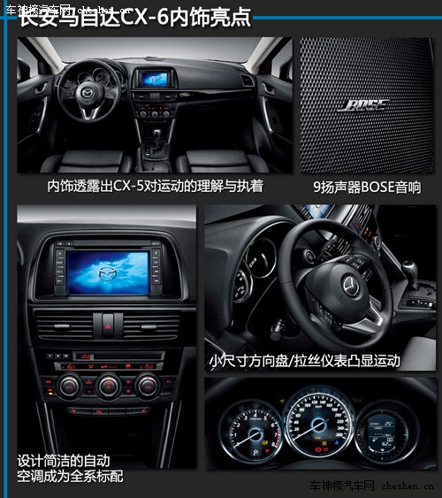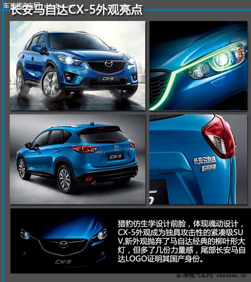 猎豹仿生学设计前脸,体现魂动设计,CX-5外观成为独具攻击性的紧凑级SUV,新外观抛弃了马自达经典的柳叶形大灯,但多了几份力量感,尾部长安马自达LOGO证明其国产身份。全系标配的纯黑色内饰、小尺寸方向、拉丝质感仪表,无不透露出CX-5对运动的理解与执着,并且高配车型还有9扬声器BOSE音响,设计简洁的自动空调也成为了CX-5的全系标配。