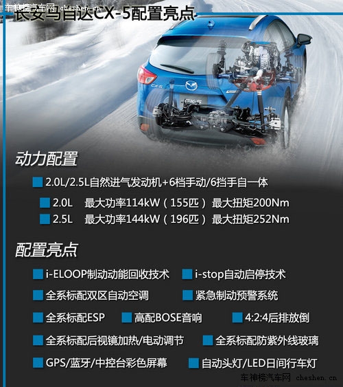 动力方面,长安马自达CX-5采用了2.0L与2.5L两种排量的自然进气发动机。2.0L自然进气发动机与之配备的是6挡手动变速箱与6挡手自一体变速箱,而2.5L自然进气发动机只有6挡手自一体可选。配置上,CX-5还是比较有竞争力的,全系标配自动空调、BOSE音响、i-stop自动启停技术、制动能量回收技术、座椅加热、泊车辅助、一键启动、自动大灯等等,几乎能够想到的都有配置。