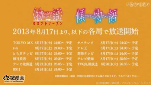 TV动画《倾物语》继公开PV第一弹short ver之后,8月16日又在官网公开了PV第二弹,除了主角阿良良木历(CV:神谷浩史)、八九寺真宵(CV:加藤英美里)以外,忍野忍(CV:坂本真绫)和斧乃木余接(CV:早见沙织)也在PV中登场对话。动画将从8月17日24:00开始在TOKYO MX等台开播。