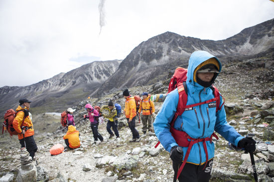 17日九点出发前,营地云雾散去,大部队终于得见白雪[微博]皑皑的珠峰东坡壮阔全貌,兴致高昂地开始了全程最艰难的一段行走。走到半途,天色转阴,很快大雨和冰雹齐加。能见度随之降到10米左右,在泥泞中小心翼翼跋涉的50余人,只能深一脚浅一脚地摸索前行。36公里的路程,队伍拖得格外绵长,最后一批志愿者下午八点才到达营地,走在前方的陈坤则一直在组织队员下撤,照顾后进行者。“在崇山圣湖中行走,会体会到我们的渺小和脆弱,但,所幸的是:就是因为生命是如此宽厚,才允许我们每个个体慢慢的、慢慢的成长!感谢所有变幻的天气和所有的险途,感谢来自大山大水给予我们的游戏,让我们明白这一次个人体验的美味!”陈坤感叹。