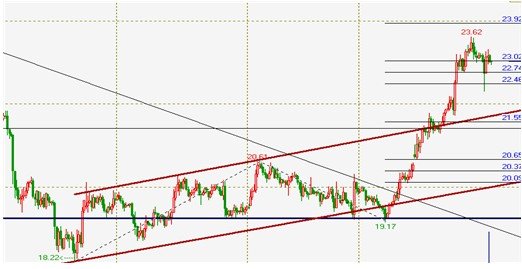 在昨天的分析文章中,我们曾经谈到,白银运行到23.6一带之后在技术上存在一定的技术压力,首先是白银19.17上涨以来运行的陡峭的上升通道的上轨道被反复的触及,就小周期来看,各项技术指标都处在高位的持续钝化当中,这样的技术走势实在是让人心有隐忧,另一方面,白银从18.22以来的上涨在浪型的划分上这一次显得较为清晰,在技术度量上23.6一带已基本上接近了本次上涨一个重要技术部目标位置23.9一带,因此在技术上白银在走到23.6一带之后出现剧烈的市场震荡也是暗合市场的走势内在规律的。