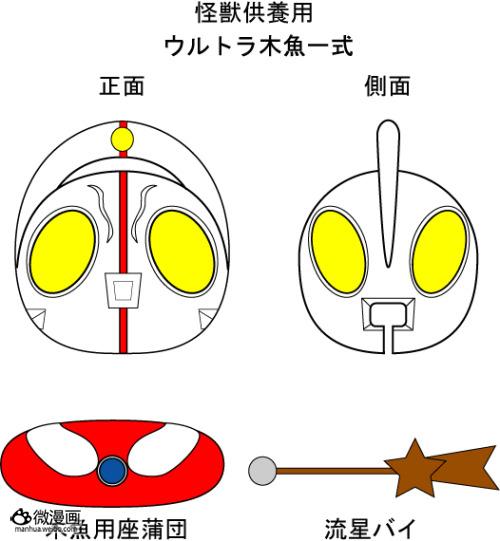 都築佛坛店表示,这次发挥在木鱼上的创意,是因为偶然感觉到木鱼的形状和奥特曼的脸很像,因而干脆在木鱼上弄出了眼睛。敲打木鱼的棒子则以特摄《奥特曼》中登场的科学特搜队的流行标志为造型。