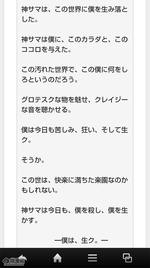 “神大人将我降生在这个世界,给了我这幅身体和这颗心,是为了让我在这个污秽的世界做些什么吧。魅惑奇异之物,传播迷恋之音,今天我仍然痛苦、疯狂并生存着。原来如此,这个世界,也许是充满快乐的乐园。神大人今天也继续向我杀来,而后又留我一命。——我,要活着——”
