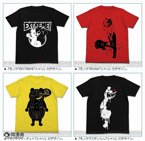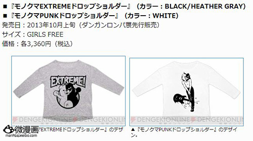 另外,黑白熊的印花T恤(全4款,每件3045日元)和女装袖衣(全2款,每件3360日元)也发售决定,将在9月14日~29日于大阪ANNEX召开的“弹丸论破展希望峰学园体验入学”中先行贩卖,正式发售日期为2013年10月。COSPA你是有多喜欢黑白熊的周边……