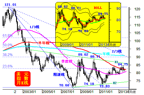 如果进一步突破,笔者以为美元应该冲击90点大关附近的真正箱顶。但美元不会真正宏观走强,关于其中原因笔者在8月21日简述过:美国不希望美元汇率强势回升,以影响或打乱美国经济复苏的进程。同时,在美国必将延续超宽松货币政策的背景下,美国及美联储也希望美元信用继续维持强势,以使得宽松的货币政策更有效用,更具持续性。故总体来看,美国不希望美元汇率在美国经济尚未进入全面荣景前表现过强,也不希望在超宽松继续延续的大背景下表现过弱。于是美国通过打击欧元,打击黄金来强化美元在全球的信用,同时有节制地控制着不让美元过于走强。故笔者倾向未来两年的美元,总体可能继续维持宏观区间震荡,区间上限在90点附近,区间下限在72至75点附近。