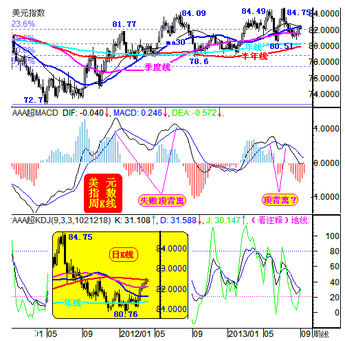 从目前来看,8月美元下行至周K线的季度线位置获得明显支撑,目前大幅脱离低点。而周K线的年线和半年线在80点附近的更强支撑根本没有受到考验。但是,目前又面临着20、30周均线的共振压力。能否进一步突破尚待观察,倾向于突破上行的可能更大。