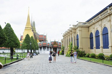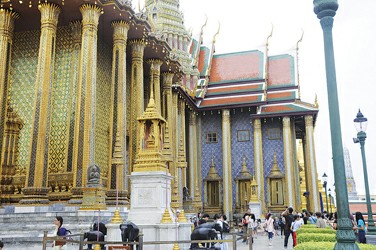 泰国是个信仰佛教的国度,曼谷因而多寺庙。第二天,最知名的大皇宫不可不去,寺庙对游客着装要求非常严格,一律不得露出上臂与腿部,有人不得不购置了长裤才被放行。这座建于两百多年前的大皇宫的宫殿群矗立在湄南河东岸,高耸的建筑造型、橙黄色、靛青色龙鳞状的瓦闪着夺目的光泽令人震撼,壮观的三层重檐、大量殿壁的彩色玻璃、金色龙首、凤尾等构件盛装出演,带来一场场金碧辉煌的视觉盛宴。或许地处热带的缘故,这些古代泰王、王妃、皇亲国戚们听政议政、婚丧嫁娶的场所和我们中国第一皇城紫禁城浩大而规整肃穆迥然不同,它,在有限的空间里向上极尽彰显奢华、精雕细琢的艳丽似一部妖娆的梵阿琳乐曲伴着这个民族曼舞飞扬的个性,成为全世界建筑艺术中一枝芳香迷人的奇葩。