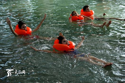 新疆盐湖城景区位于新疆首府乌鲁木齐市东郊的盐湖,天山博格达峰南麓。46平方公里宽阔平静的盐湖水域中,富含有大量的石盐、芒硝等矿物质,也因此其湖水的含盐量是海水的近十倍,浮力奇高,人可浮于水中而不沉,被称之为“中国的死海”。 8月25日,全国网媒记者来到盐湖城景区体验死海漂浮的神奇。
