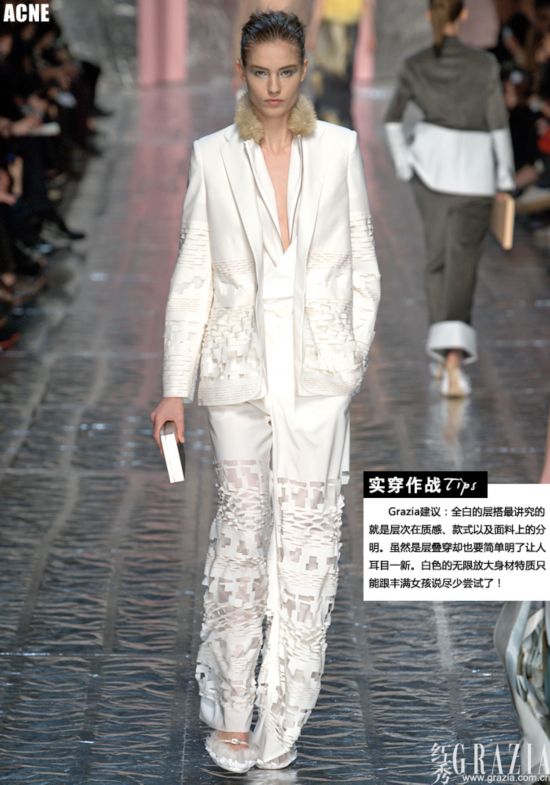 今年冬天,摆脱了黑色的沉闷乏味,层层叠叠的白色是最应景的装扮。不同质感、不同款式与纹样的对比,是白色看起来高级又前卫,充满时代感。就让我们一起去偷师T台搭配吧!