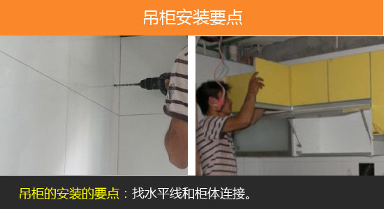 吊柜的安装的要点:地柜安装的要点有两个,找水平线和柜台连接。