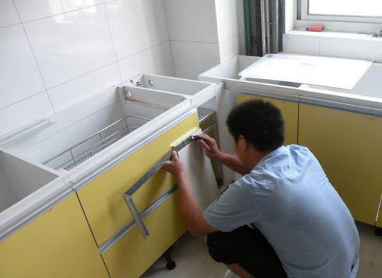 调整柜门:安装橱柜的最后步骤是进行门板调整,保证柜门缝隙均匀与横平竖直,地柜进深一般为550毫米,吊柜为300毫米,消费者也可以根据实际情况进行调整。调整完柜门后,工人还应该清理安装橱柜时留下的垃圾,保证业主厨房的清洁。
