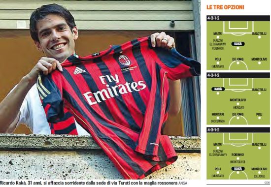在周一回到米兰与球迷见面之后,卡卡立刻又返回马德里整理自己的东西,他将于北京时间周四再次回到米兰,正式与球队会合。巴西人的重返米兰后的首秀时间也已确定,本周末AC米兰安排了一场与瑞士基亚索俱乐部的热身赛,前AC米兰球星赞布罗塔正在这支球队中担任教练兼球员的角色。AC米兰在国家队比赛周安排这样一场热身赛的目的很简单,就是要检验卡卡目前的竞技状态,以及评估他可以阿莱格里阵中踢的位置。意大利媒体称,加利亚尼强烈希望卡卡能够填补博阿滕走后留下的前腰空缺,但实际上卡卡也能胜任影子前锋、甚至后腰的角色。《米兰体育报》给出的数据称,在以前卡卡代表AC米兰出场的270场比赛中,球队有164场比赛踢的是4-3-1-2阵型,69场比赛时4-3-2-1阵型。