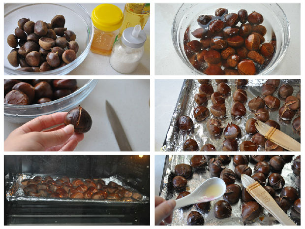 5.在开口的栗子上再刷上一层蜂蜜可糖的混合物