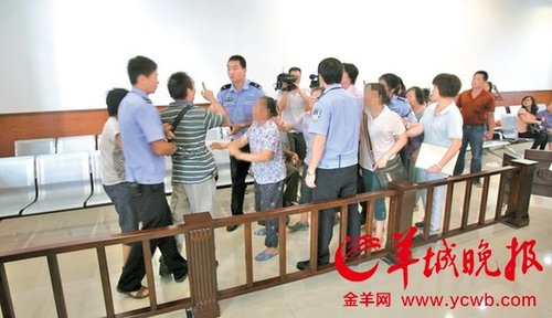 庭审结束后,母子、兄妹对骂,法警劝阻。