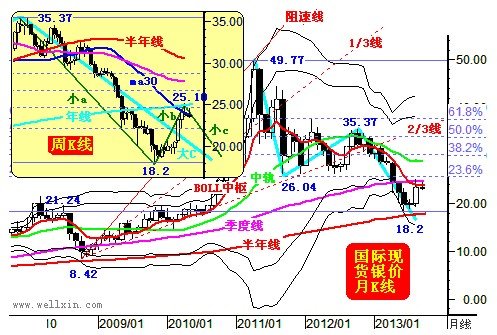 再从2011年银价见顶49.77美元之后的整个调整波段来看,目前的反弹尚未触及此宏观调整波段反弹的23.6%黄金分割位,目前属于典型的弱势反弹幅度。再从1920.8美元至1180.15美元的金价宏观调整波段来看,反弹的23.6%黄金分割位在1354.9美元,7月金价反弹即相对精确触及此位。故就相对反弹幅度而言,金市强于银市。