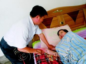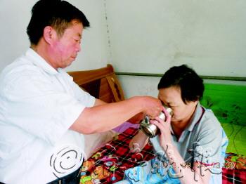 高强在照顾妻子喝水。