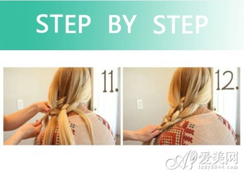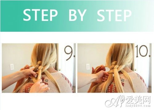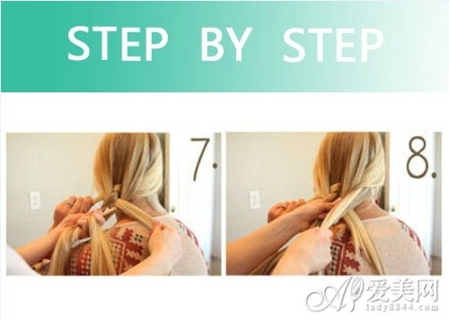 再穿过最后一股头发的下方。然后拿起右四股头发交叉最后一股头发上方。