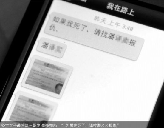 坠亡女子最后发给三哥的话,“如果我死了,找潘××报仇”。