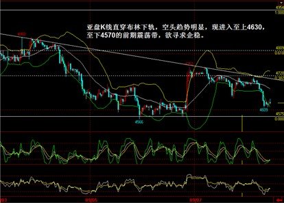 从30分钟图看,现盘面进入4570-4630的震荡带中,马上要进入欧盘,市场需要重新定位解读,有继续下行的风险。4小时KDJ继续下行趋势明显,RSI有反弹迹象,1小时KDJ与RSI均呈现反弹。盘面能否企稳将是下步操作关键。