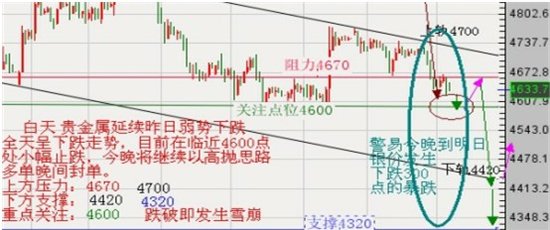 保守的反弹至4670~4700两线、激进4600---4620附近空,止损40点,目标4590;跌破4600可追空,止损30元,盈利50~120元。保守4420~4320两处谨慎做多,激进4500多单,止损40点,目标4620 ;10%仓位.