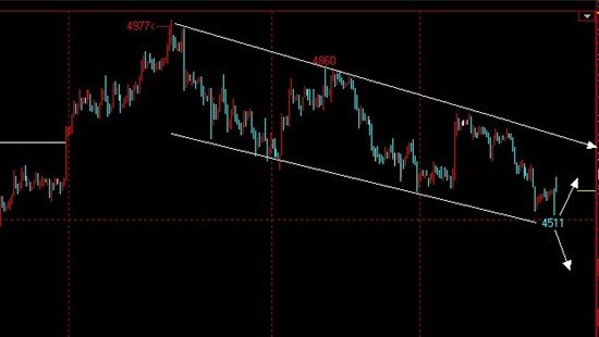 现货白银价格自高点4977开始回调,到目前价格4511的低点,形成了一个走势良好的下降通道。目前价格处在通道的低端,节奏上是有需要反弹的需要,在前期4500附近也是一个成交密集区,所以今日操作上做多为主,同时关注通道低端的突破情况,顺势做空。