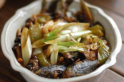 1.准备好所用食材:充分沥干的鱼入油锅煎至两面金黄。(我用铁锅煎的,怕粘用不粘锅,表面拍淀粉也能有效的防粘,一面煎透再翻面就不容易粘。)