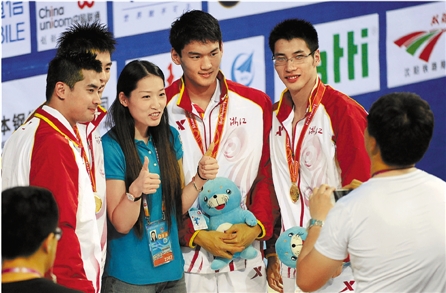 4×100混合泳接力,吴鹏、吕志武、徐嘉余和毛飞廉联手拿到冠军。本报记者潘良干摄