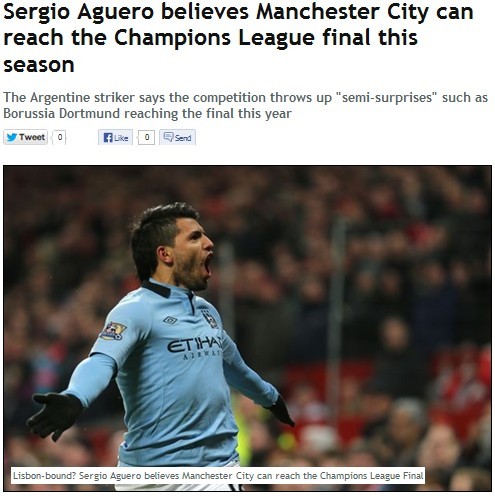 曼奇尼下课的一个重要原因就是没能带队在欧冠中取得突破,为了完成这一目标,曼城在今夏聘请了欧冠经验丰富的佩莱格里尼,并且砸下1亿英镑重金买进5名球员,这让俱乐部主力前锋阿奎罗信心满满,阿根廷人豪言蓝月亮能够制造惊喜,闯入本赛季欧冠决赛,就像上赛季的多特蒙德。