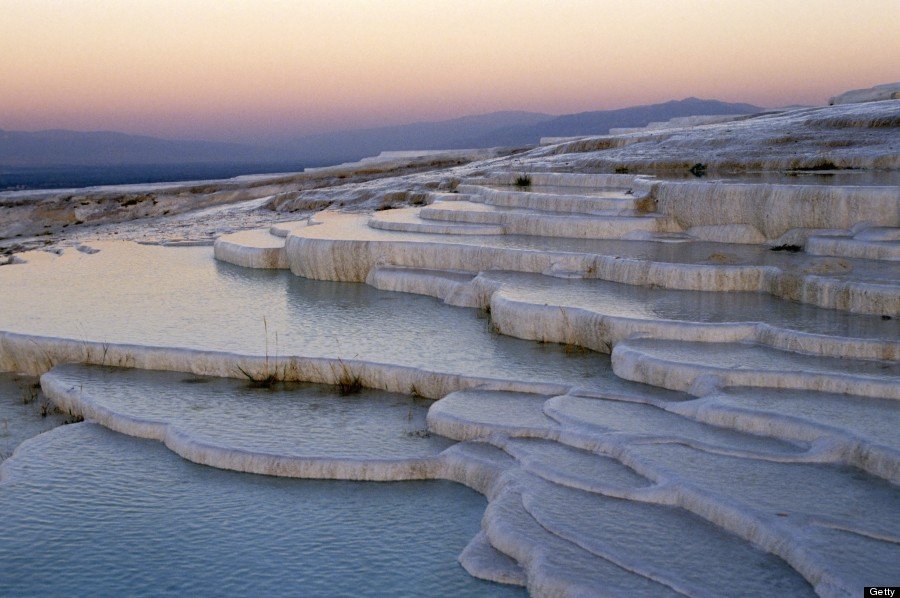 土耳其,棉花堡钙华池 温泉水从高处岩石中流出,泉水所到之处在历经千百年的钙化沉淀之后,形成了钙华池梯田。该池阶梯落差非常明显,是世界上最著名的钙华梯池景观之一。"