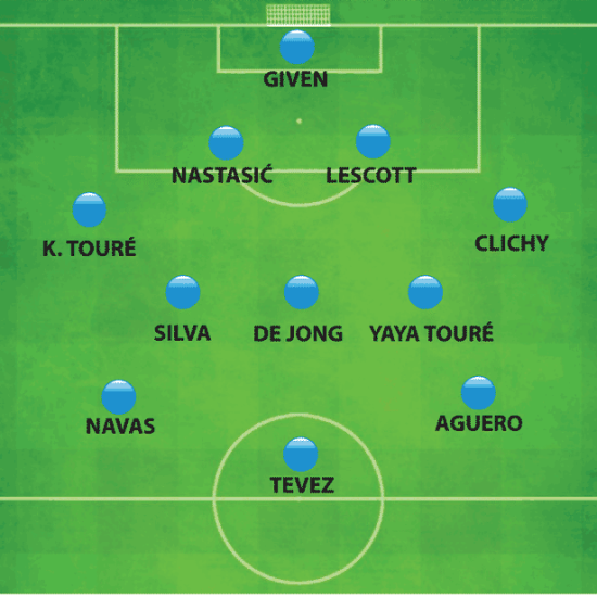 经过票选确立的主力11人名单为: 门将吉文,后卫线上是科洛-图雷、纳斯塔西奇、莱斯科特和克里希,3人中场分别是亚亚-图雷、德容和席尔瓦,前锋则由阿圭罗、特维斯和纳瓦斯当选。替补7人分别是潘蒂利蒙、麦孔、德米凯利斯、费尔南迪尼奥、米尔纳、内格雷多和贝拉米。