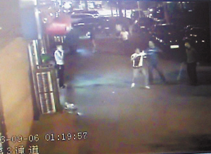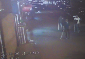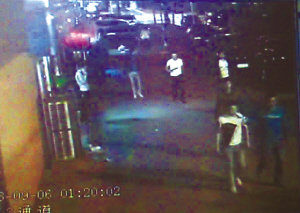 记者在当天现场的监控录像看到,1时18分许,陈雷3人拿着镐把行走在空无一人的大街上。